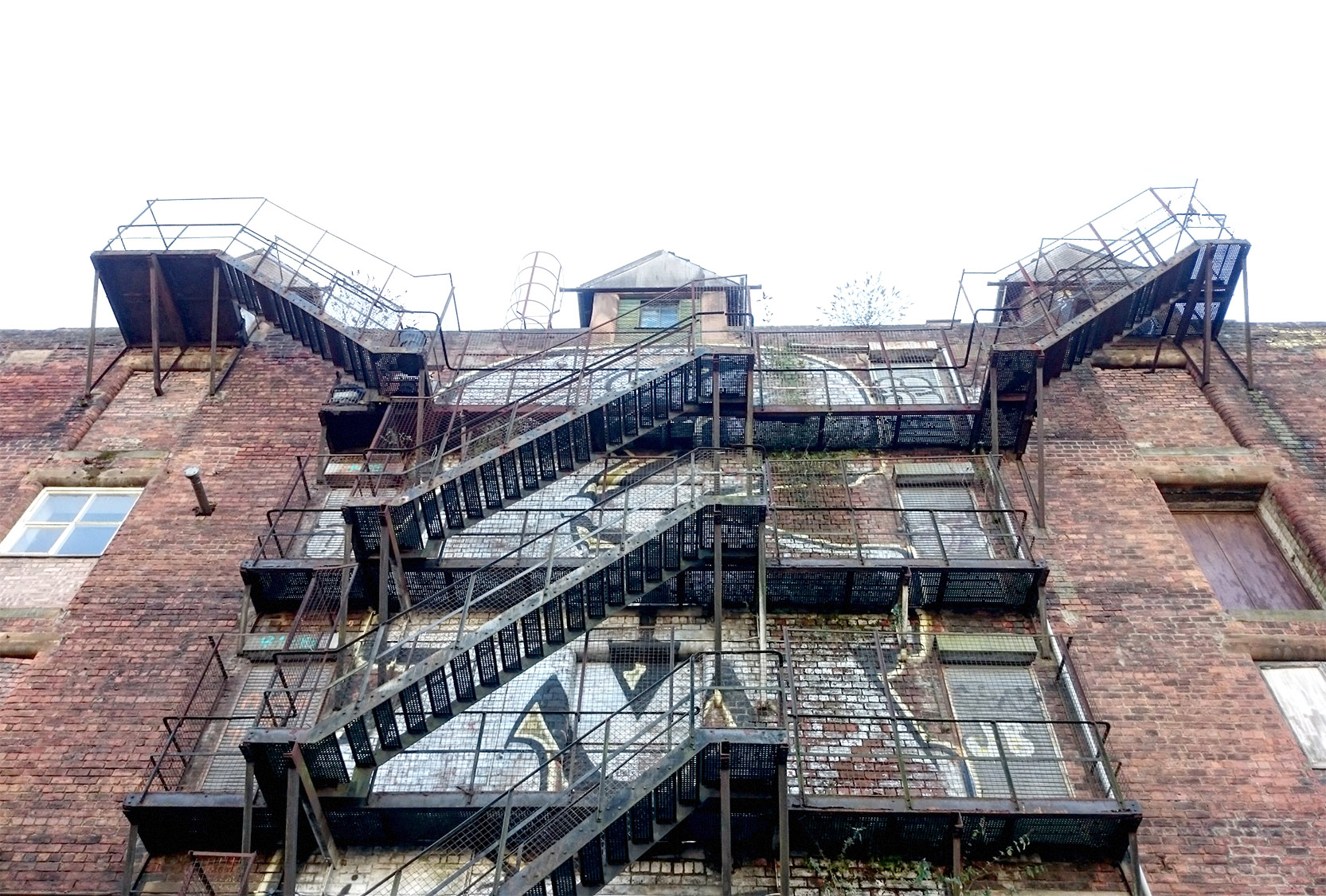 The north elevation originally had an elaborate metal fire escape stair and an iconic graffiti tag that was reinstated.