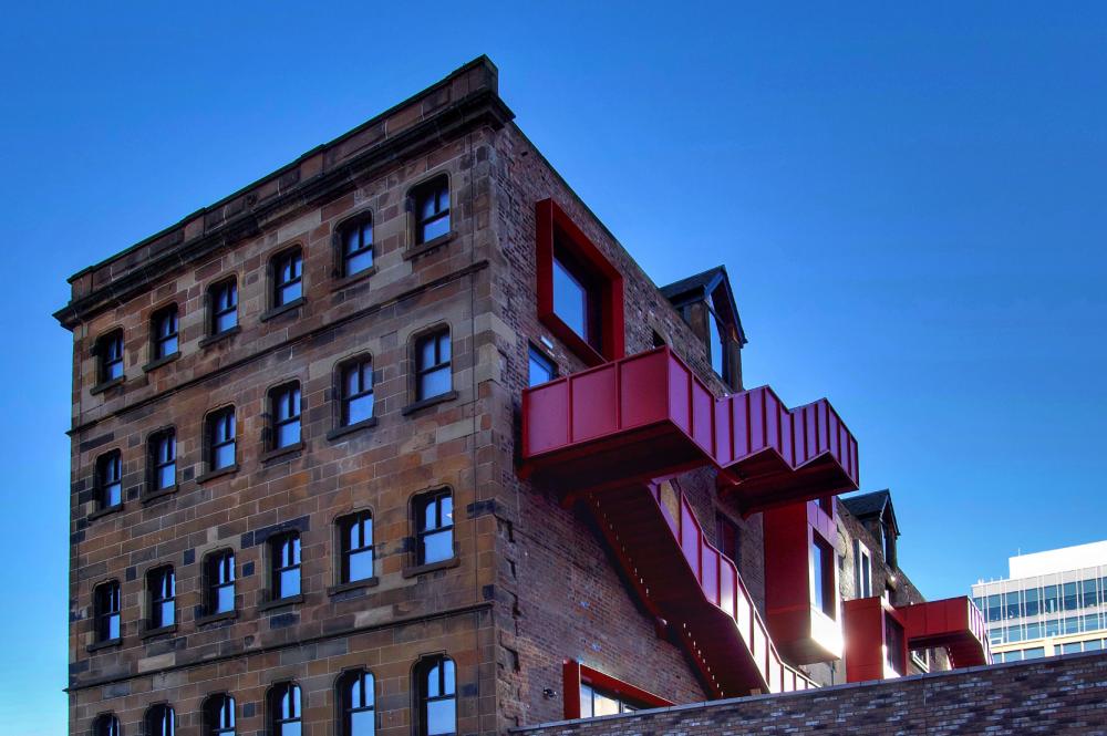 The buildings four storey south elevation has a sober character with small deep set windows within a massive sandstone facade, while the north elevation is engineering brick and scaled by a massive red fire escape.