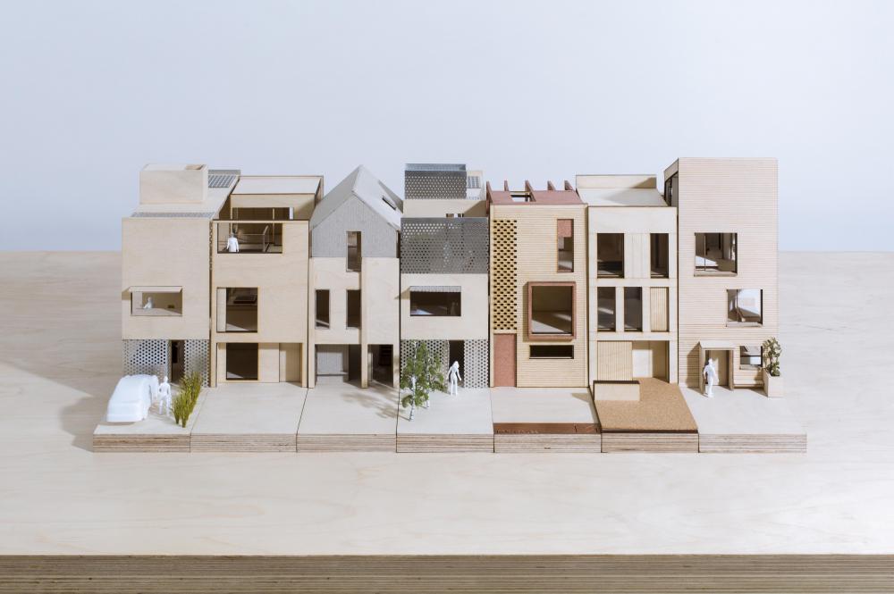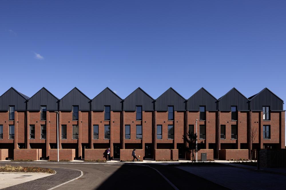 The architectural language is underpinned by a considered street hierarchy and in rooting the buildings in their context. Both designs celebrate the North Glasgow context, with a rigour and rhythm applied to elevations, and a simple and harmonious material palette. The two architectures sit side by side, complementary to each other, while creating different street conditions. The Ann Nisbet Studio terraces, with their sawtooth roofscape, create a dynamic edge onto Vinter Street and along the northern edge of the site. The Stallan-Brand terraces are located at the interior of the site, forming the internal streets.