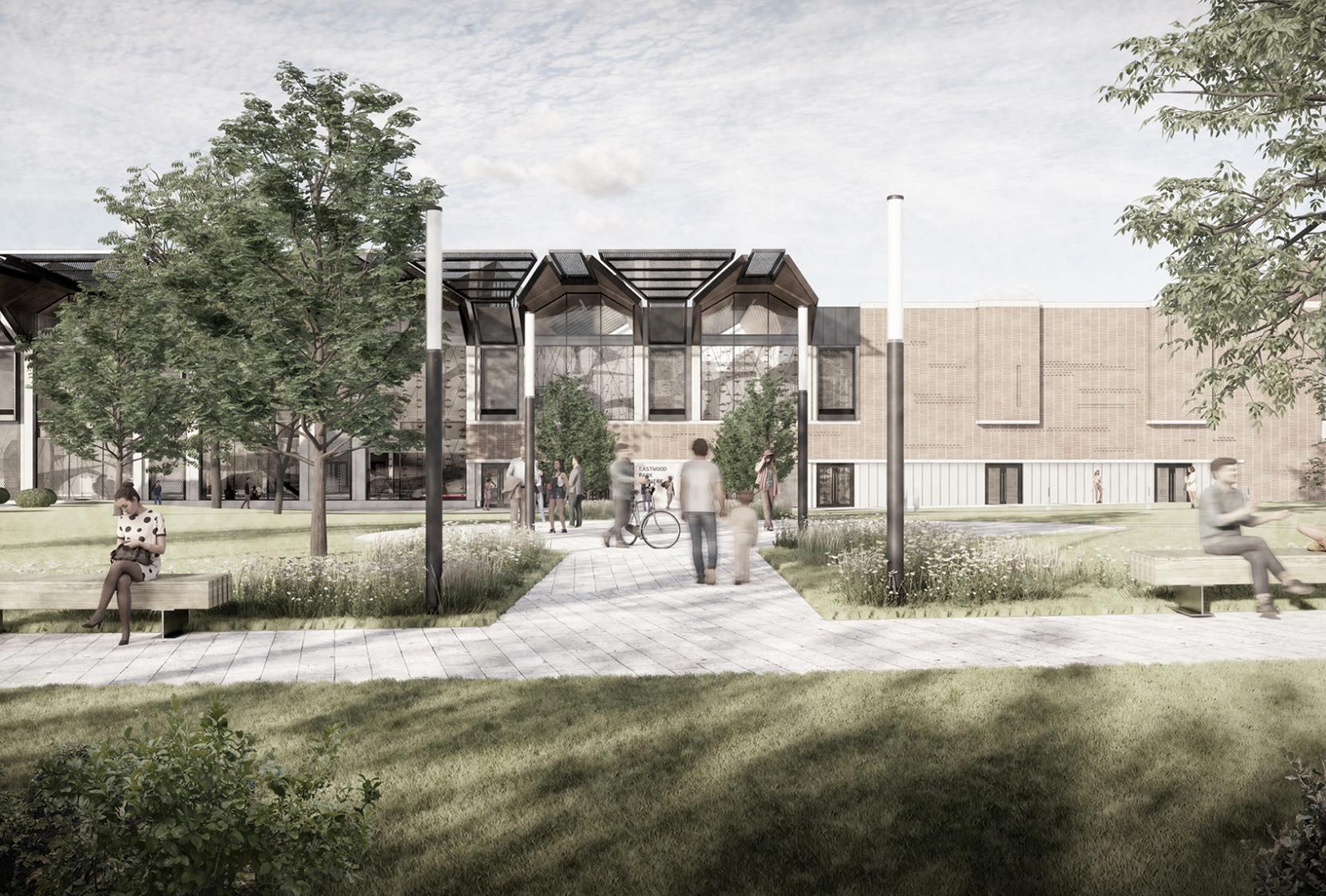 Stallan-Brand has submitted planning for a new Leisure Centre, Theatre and Library at Eastwood Park, seeking a transformational impact; optimising Eastwood Park as a major asset for the community and enhancing the civic identity of the Park, the quality of landscape and heritage, and blend of activities.