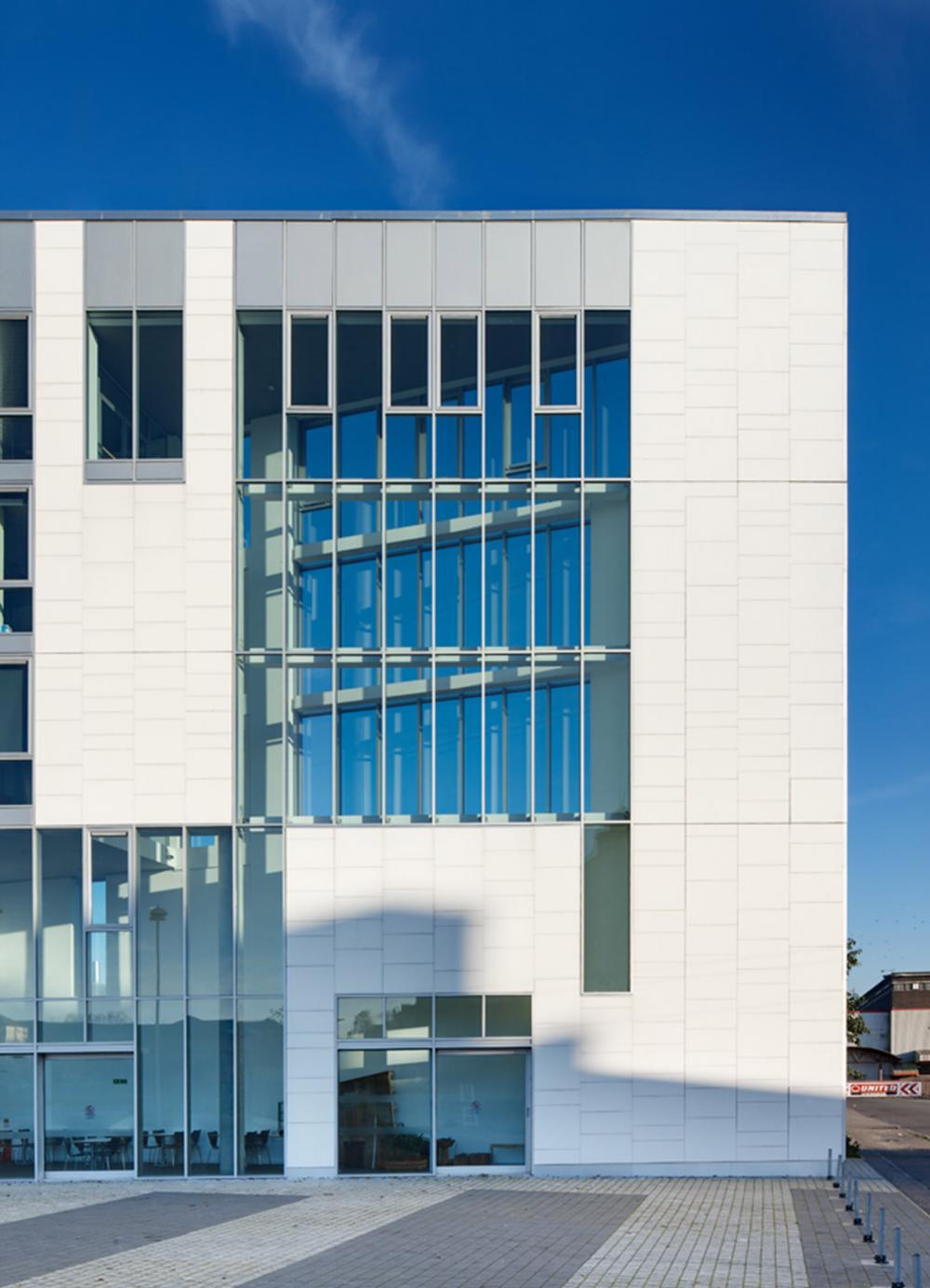 The new campus has fulfilled and gone beyond the client’s initial brief which was very simple; to deliver a new architecture that was both iconic and inviting and that would ultimately inspire learners. The sharp clean lines and bright reflective finishing of the 5-storey building and double-height workshop give the college a real presence and purposefully stands out from the local surroundings. The landscaped south-facing main entrance plaza provides a social space complete with benches, bicycle stands, and cherry blossom trees.