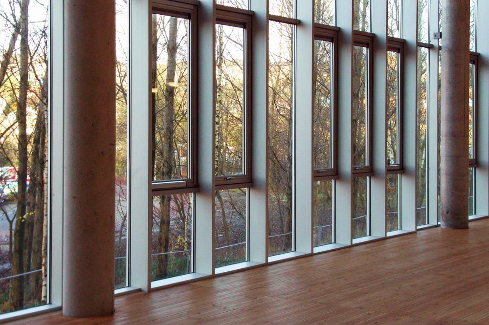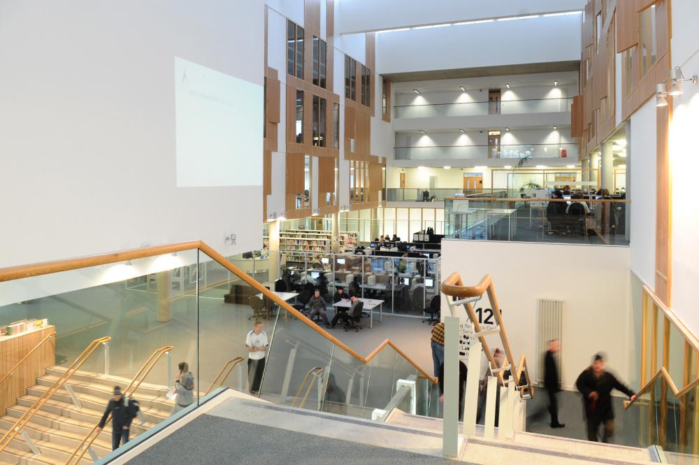 Internally accommodation consists of a sports hall, learning resource centre, lecture theatre, dance studio, TV studio, large winter garden and cafe as well as a range of classroom arrangements, meeting rooms and administration areas.