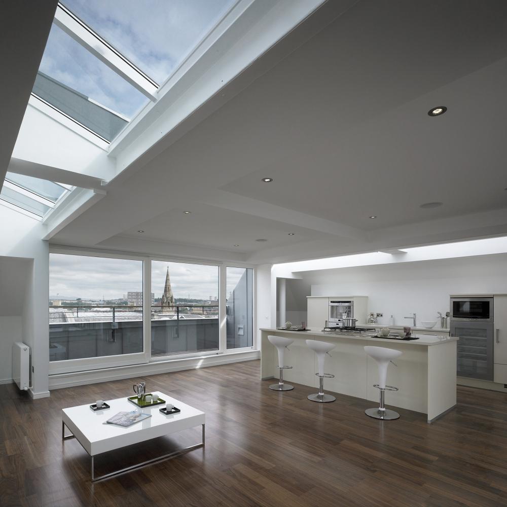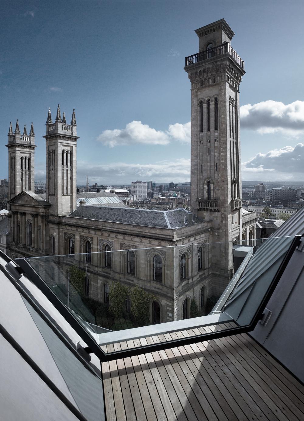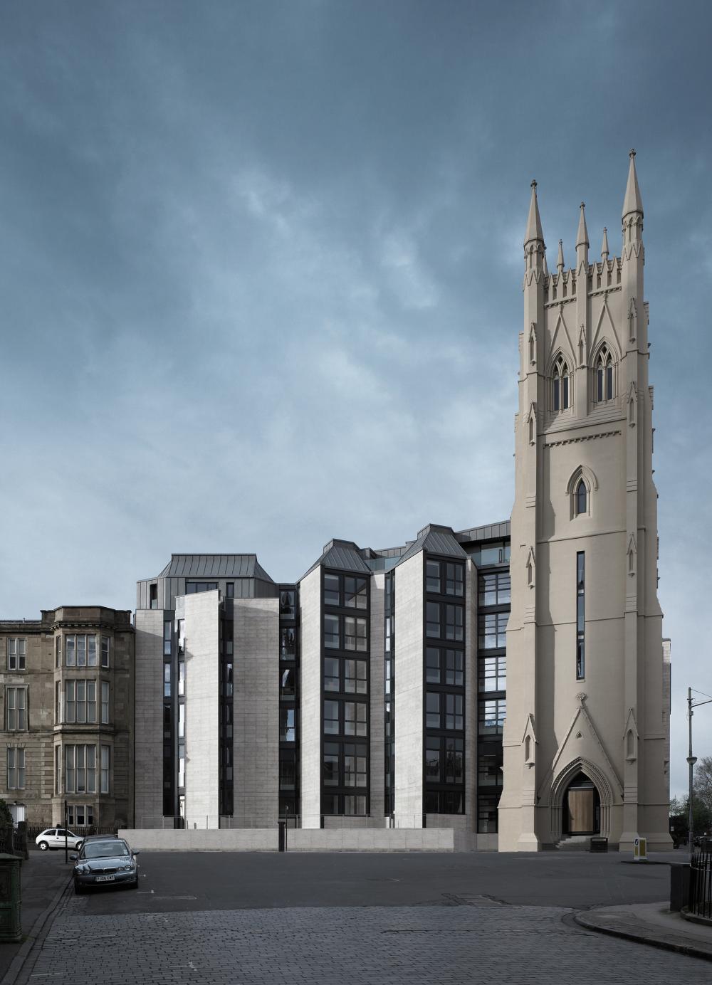 One of Glasgow’s most prominent landmarks, the Grade B listed tower of the former park church in the West End of Glasgow, is part of the redevelopment that comprises 50 high-end apartments. The development involved transforming the existing 1960’s office building that replaced the original church reusing its structural concrete frame and floor slabs to create a new residential building. The listed tower element has been integrated into the apartment layouts providing unique living accommodation in one of the city’s best addresses.