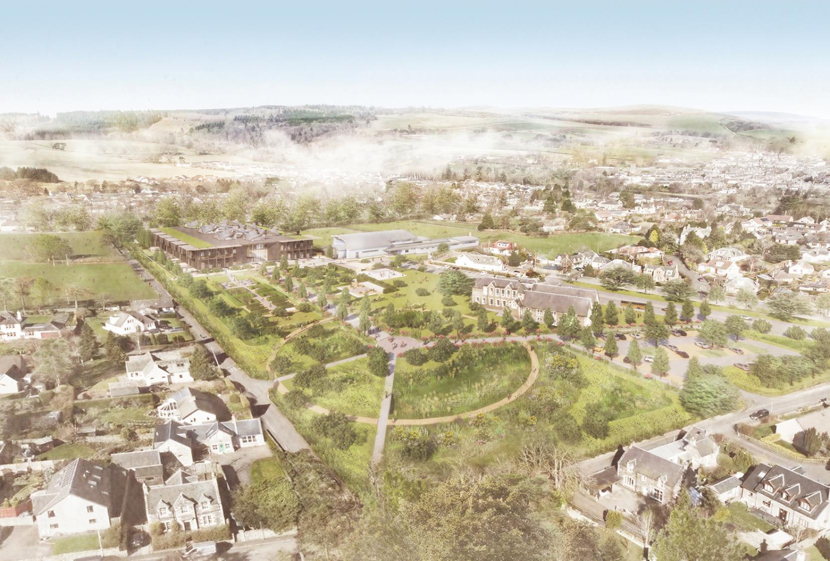 Education provision in the Scottish Borders is going through significant transformation and the requirement for investment in a new Peebles High School was accelerated due to a fire in 2019, resulting in parts of the school being rendered completely unusable. Our proposal seeks to create a new campus on the existing grounds that sensitively integrates with the immediate landscape and the local townscape. Our approach facilitates a simple tandem build to ensure that the existing school can remain operational during construction.