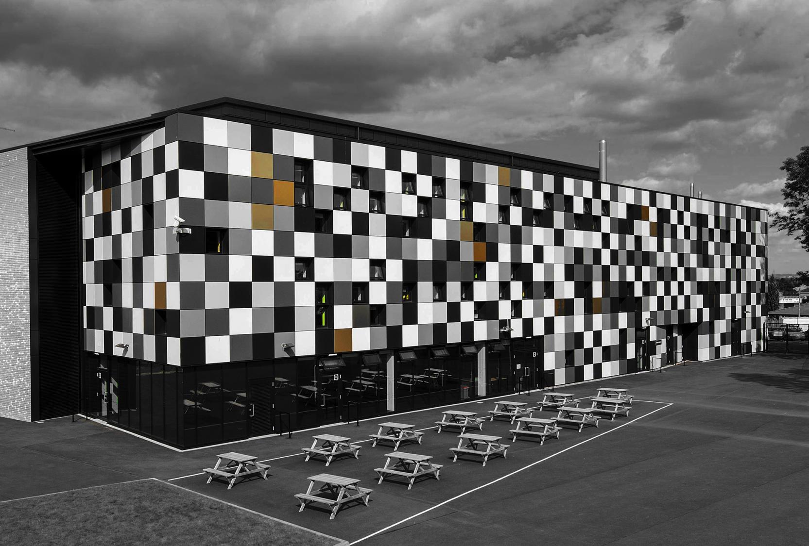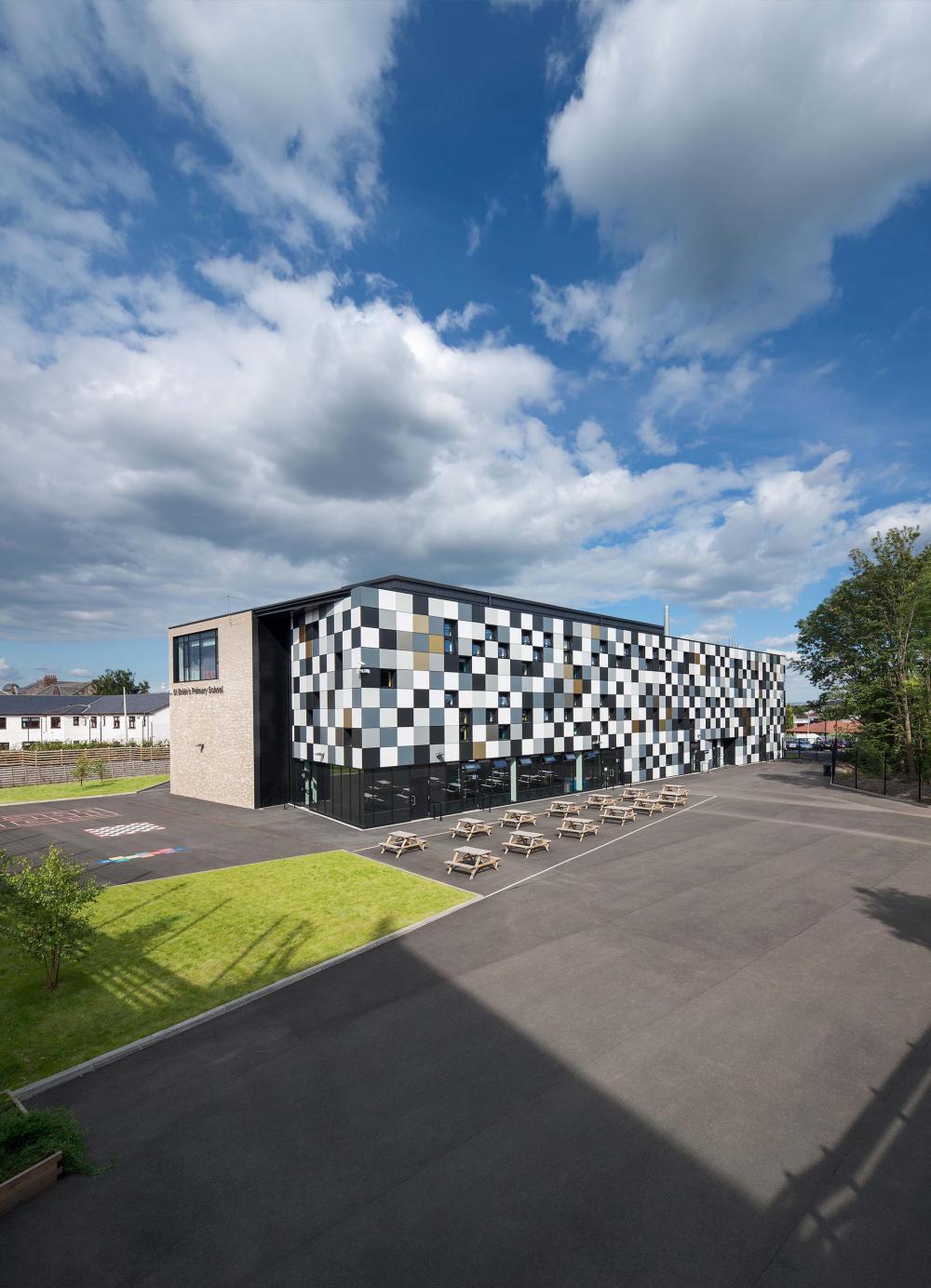St. Bride's school was designed to respond to a challenging urban site with a busy road to the north and dramatic changes in level to the south into woodland. The new school, therefore, presents two very different elevations in response to its site; a more formal public elevation to the north and a playful south-facing elevation overlooking a small wooded area.
