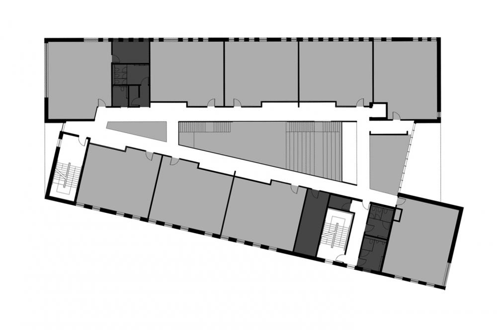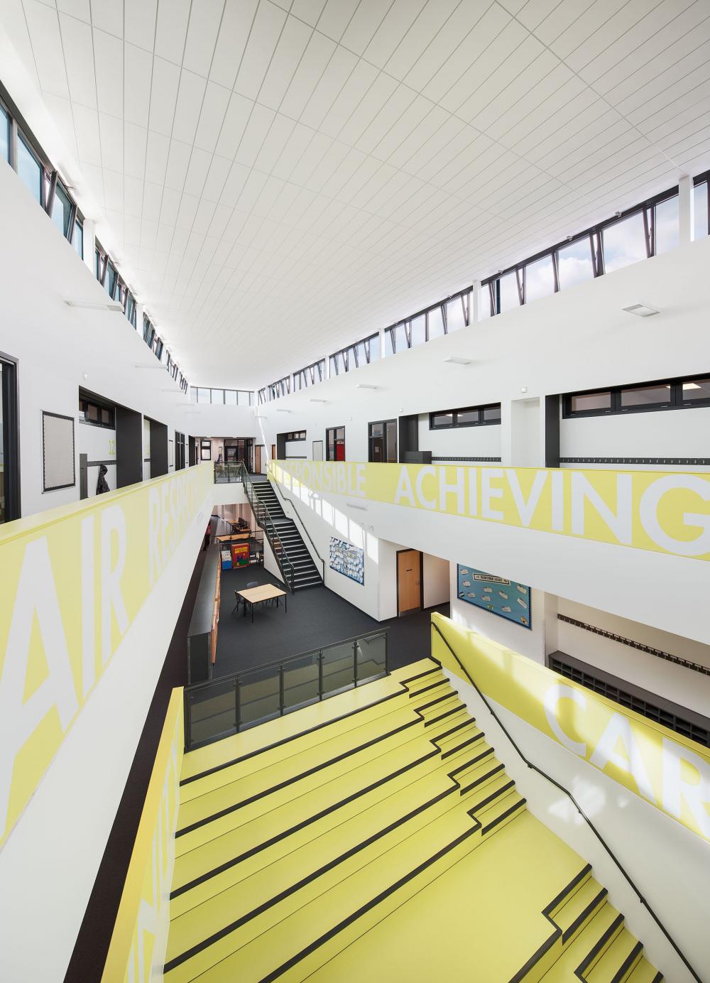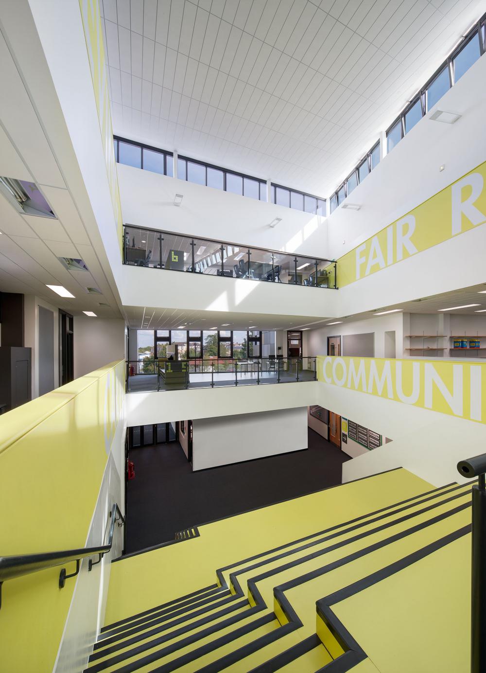 The building's plan also responds to the site's form by adopting a plan that has two classroom blocks splayed so as to create a small internal courtyard. The internal space is an important feature in the school uniting the entire school community and teaching team. A progressive stair at the heart of the plan is expanded to create an assembly and performance area.