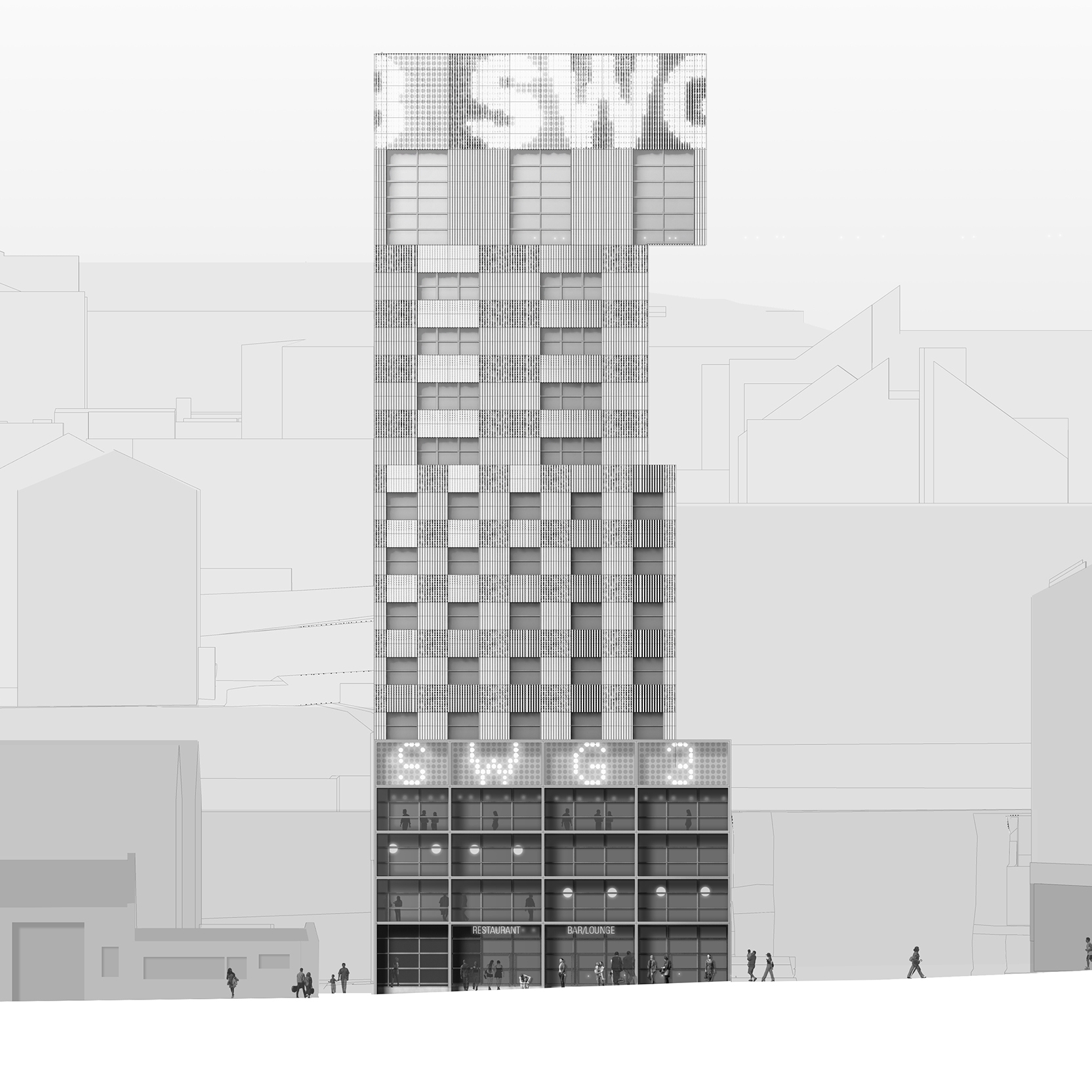 The hotel is rationally planned within a strict structural grid whilst providing a range of considered room types and amenity spaces. The building is organised vertically to form a layer cake of distinct experiences.