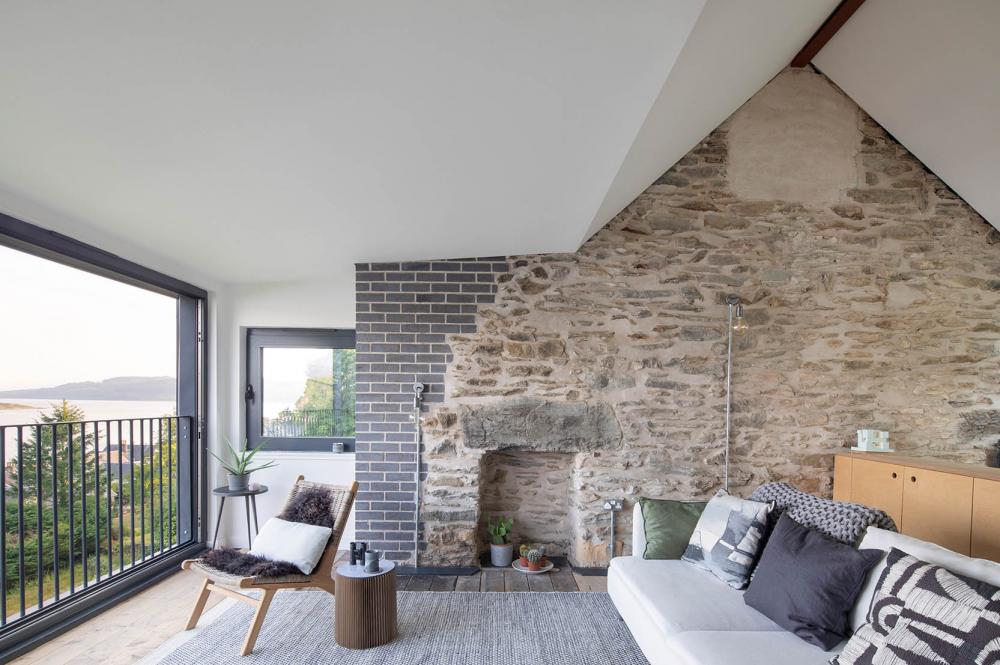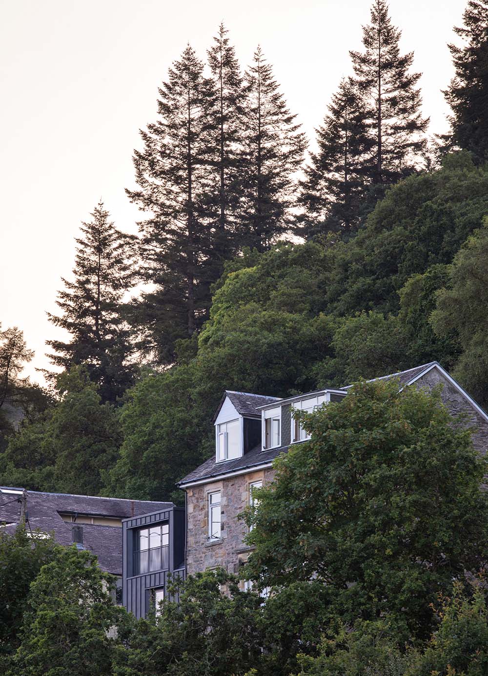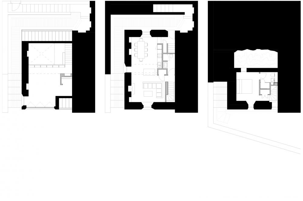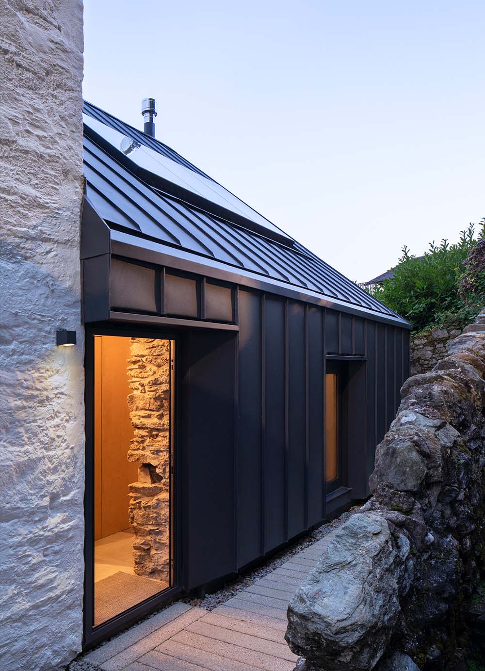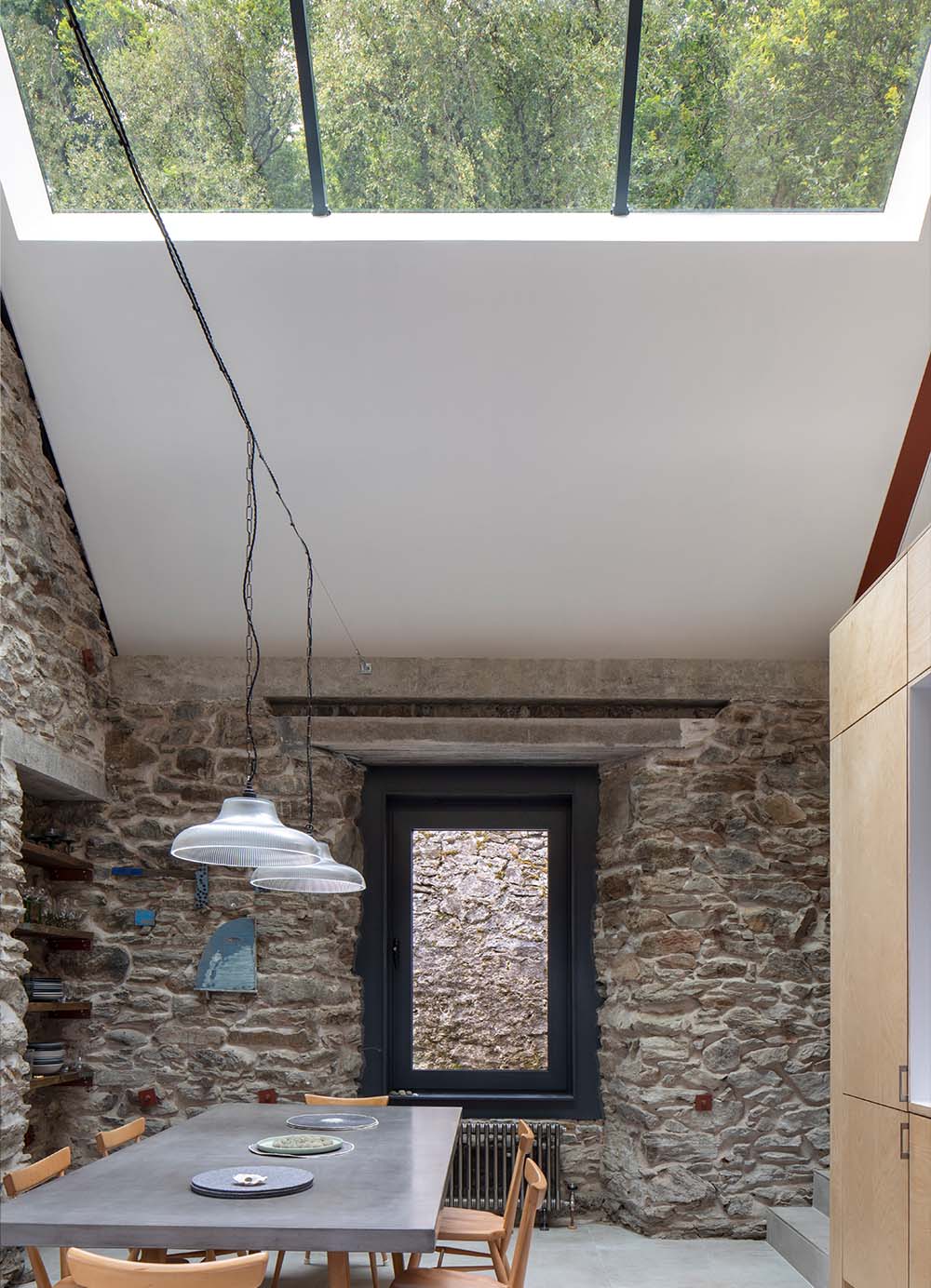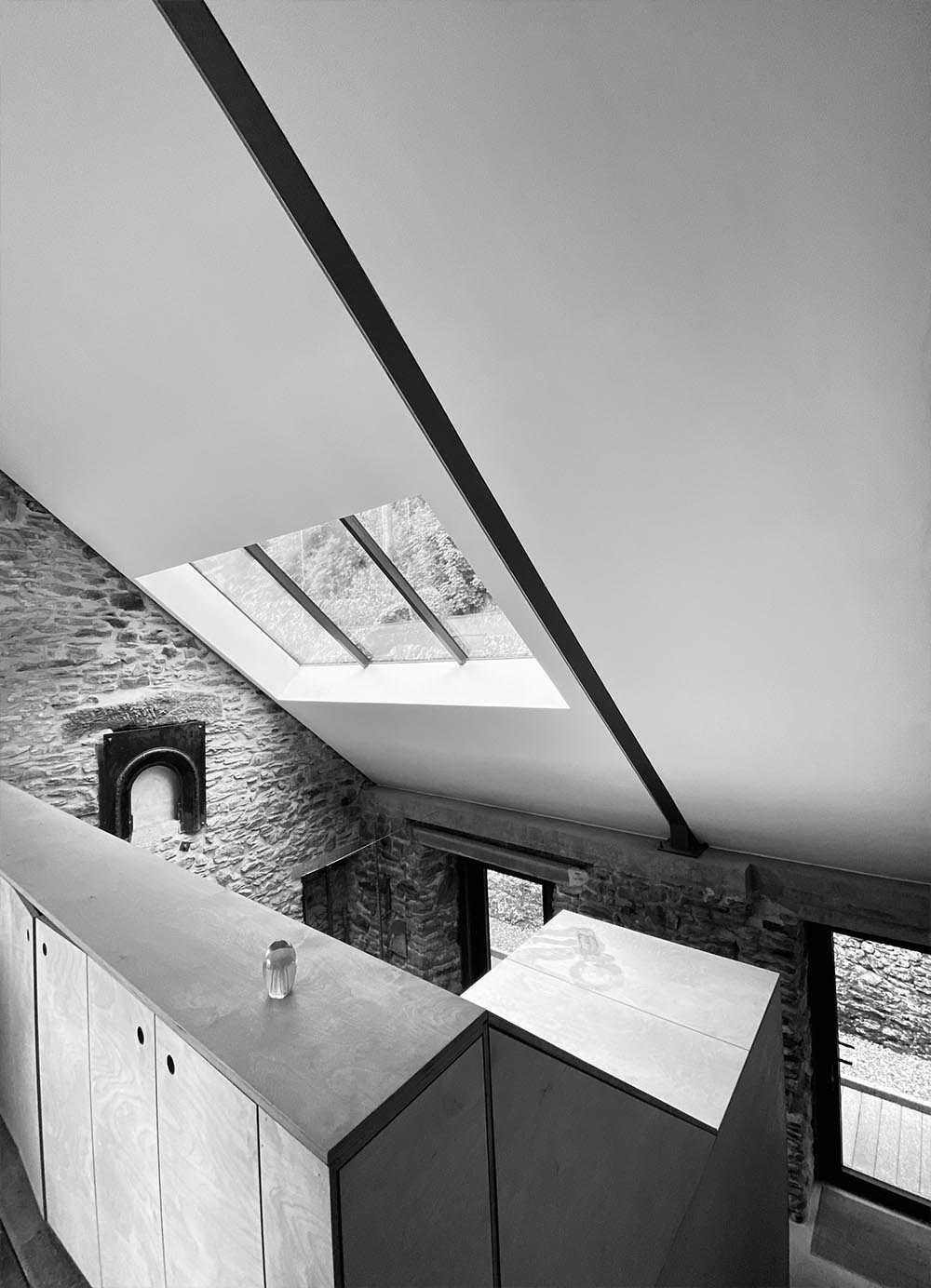 A full metal jacket wraps what remains of the stone walls, the structure of two former room and kitchen apartments. The thermal diagram of the original building is inverted with the imposition of a super-insulated steel overcoat. This technical move dramatically alters the vernacular, creating a stealth-like external aesthetic in contrast to a raw cave-like character internally.