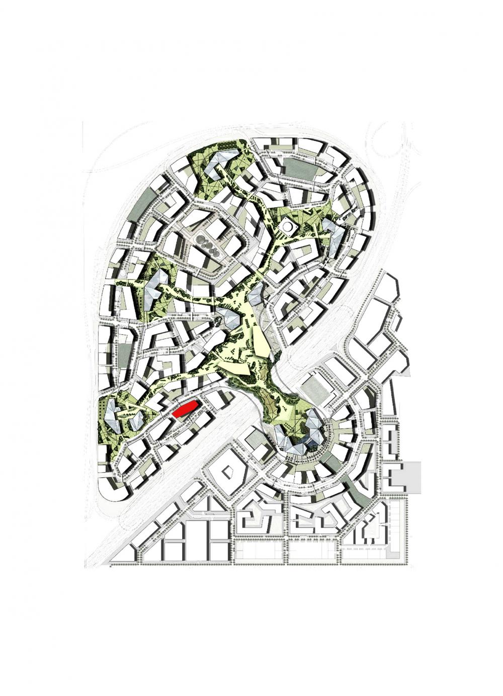 The building is designed as a counter to the other buildings in terms of its form, maintaining a strict vertical gridded expression within what is an extraordinary collagist townscape.