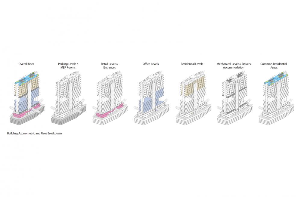 The building is a vertical layer cake of function from basement parking, retail levels, offices, residential and rooftop penthouses and garden.