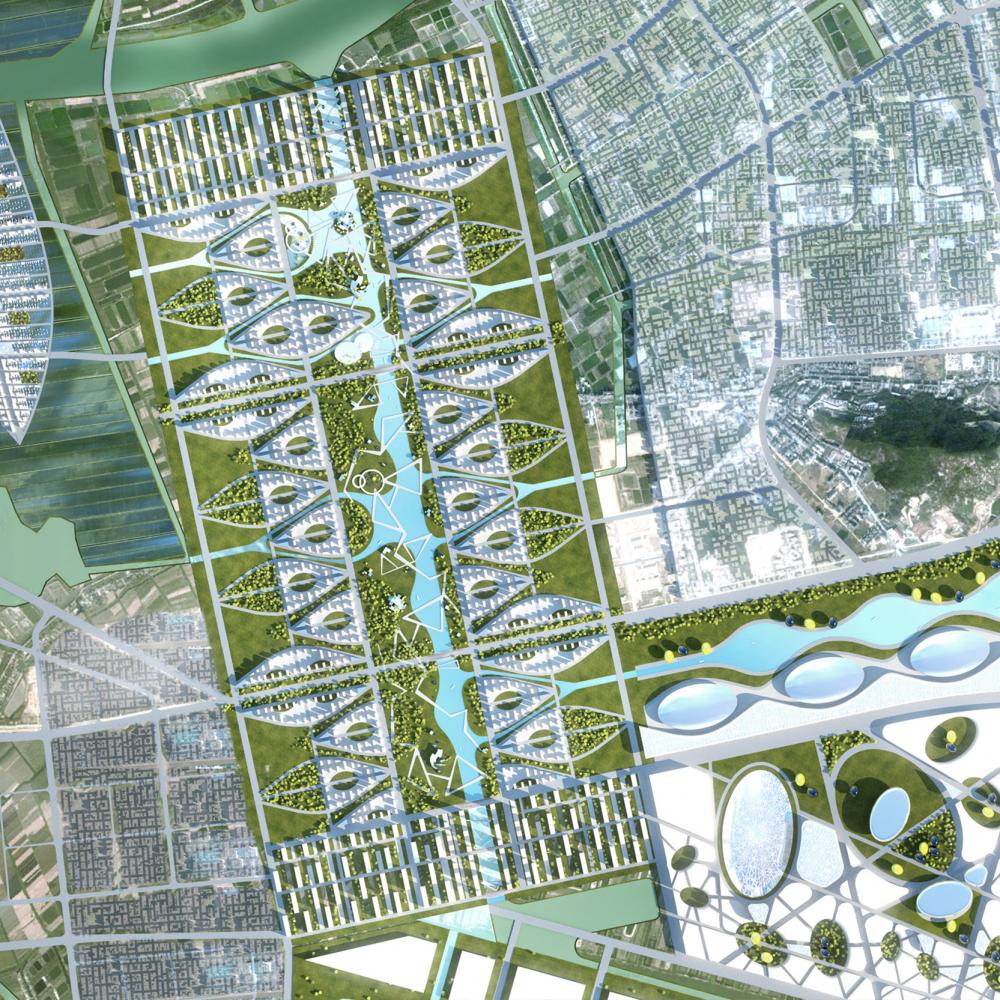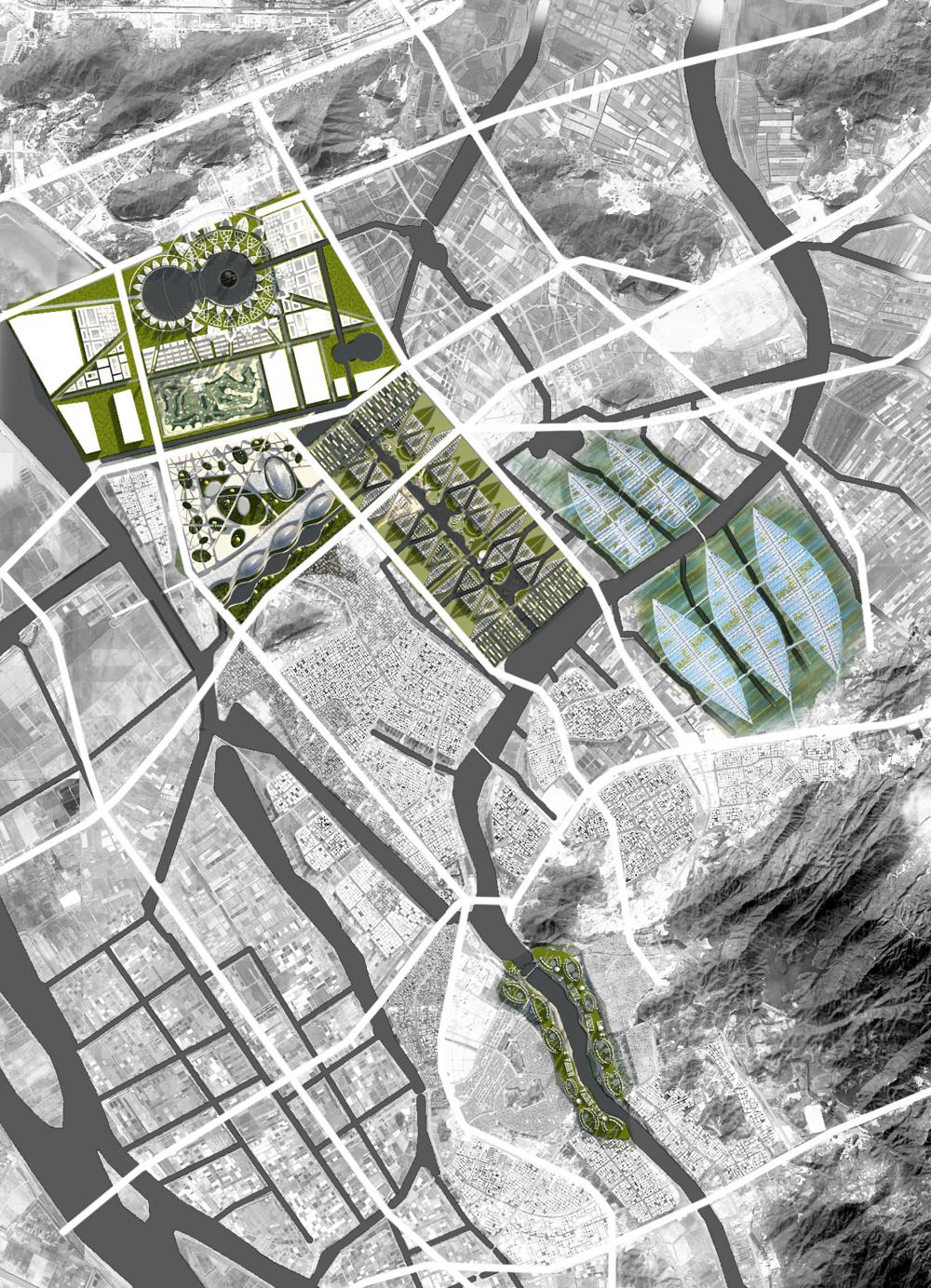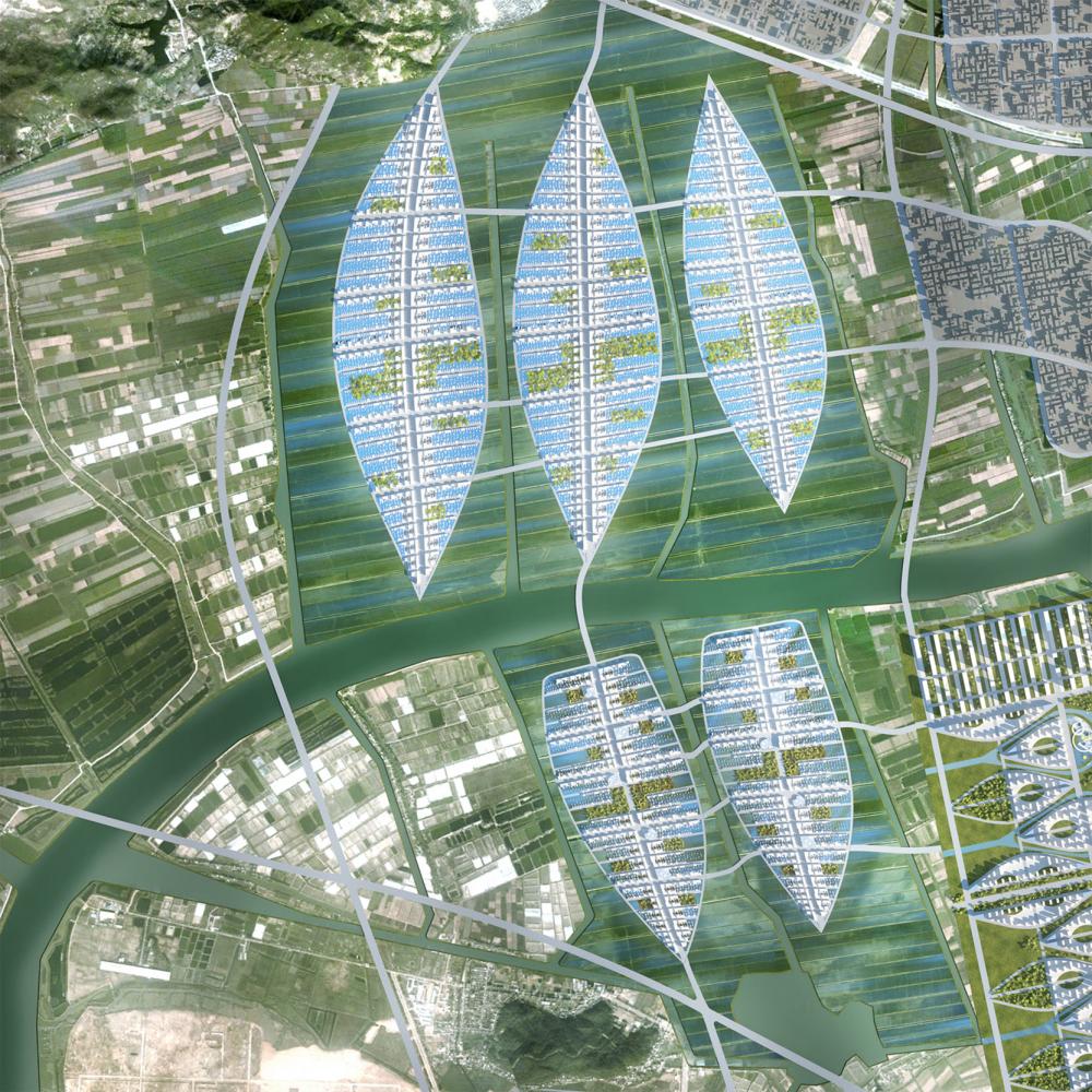Thematically different urban quarters were designed that responded to a mixture of land uses ranging from education to industry. Critically the integration of flood plains and farmland was a feature that unites all locations, with local food production mixing with residential and office environments to create new hybrid landscapes.